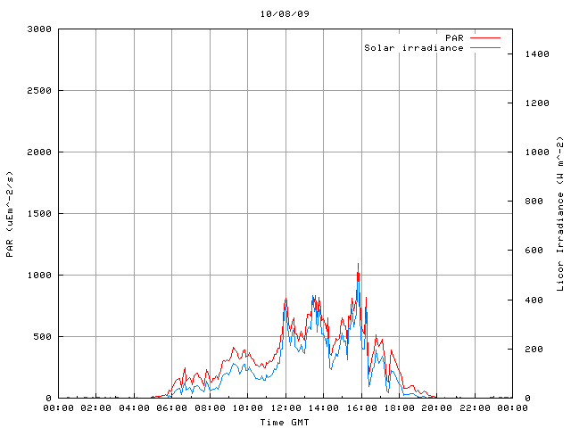 The PML meteorological station, situated on the south-west corner of the building roof, consists of a Hygroclip S3 temperature and humidity sensor housed in a radiation shield, a Mierij Meteo solid state wind sensor (MMW-005), a Chelsea instruments half-hemisphere PAR sensor, a Li-Cor pyranometer (LI-200SZ) and an Omni Instruments 6" tipping bucket raingauge (RG200). The data are logged every 5 minutes using a Pace Scientific XR5 data logger. The real-time rainfall data is likely in error - the correct values will be displayed after a time lag of approximately 24 hours. The meteorological station is sheltered from winds in the north-east and underestimates winds from this quarter. To use these data please contact Dr Tim Smyth.