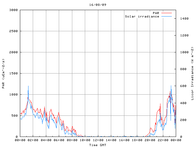 The PML meteorological station, situated on the south-west corner of the building roof, consists of a Hygroclip S3 temperature and humidity sensor housed in a radiation shield, a Mierij Meteo solid state wind sensor (MMW-005), a Chelsea instruments half-hemisphere PAR sensor, a Li-Cor pyranometer (LI-200SZ) and an Omni Instruments 6" tipping bucket raingauge (RG200). The data are logged every 5 minutes using a Pace Scientific XR5 data logger. The real-time rainfall data is likely in error - the correct values will be displayed after a time lag of approximately 24 hours. The meteorological station is sheltered from winds in the north-east and underestimates winds from this quarter. To use these data please contact Dr Tim Smyth.