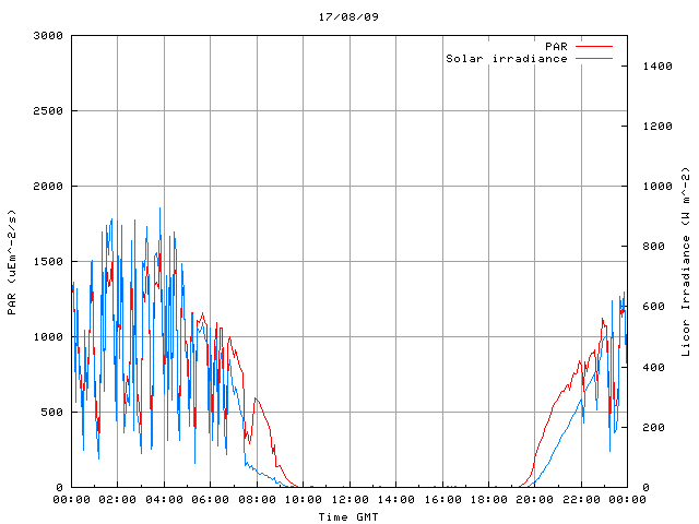 The PML meteorological station, situated on the south-west corner of the building roof, consists of a Hygroclip S3 temperature and humidity sensor housed in a radiation shield, a Mierij Meteo solid state wind sensor (MMW-005), a Chelsea instruments half-hemisphere PAR sensor, a Li-Cor pyranometer (LI-200SZ) and an Omni Instruments 6" tipping bucket raingauge (RG200). The data are logged every 5 minutes using a Pace Scientific XR5 data logger. The real-time rainfall data is likely in error - the correct values will be displayed after a time lag of approximately 24 hours. The meteorological station is sheltered from winds in the north-east and underestimates winds from this quarter. To use these data please contact Dr Tim Smyth.
