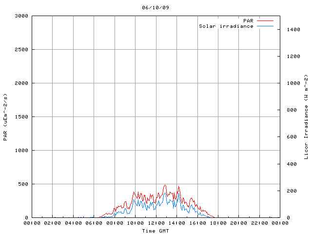 The PML meteorological station, situated on the south-west corner of the building roof, consists of a Hygroclip S3 temperature and humidity sensor housed in a radiation shield, a Mierij Meteo solid state wind sensor (MMW-005), a Chelsea instruments half-hemisphere PAR sensor, a Li-Cor pyranometer (LI-200SZ) and an Omni Instruments 6" tipping bucket raingauge (RG200). The data are logged every 5 minutes using a Pace Scientific XR5 data logger. The real-time rainfall data is likely in error - the correct values will be displayed after a time lag of approximately 24 hours. The meteorological station is sheltered from winds in the north-east and underestimates winds from this quarter. To use these data please contact Dr Tim Smyth.