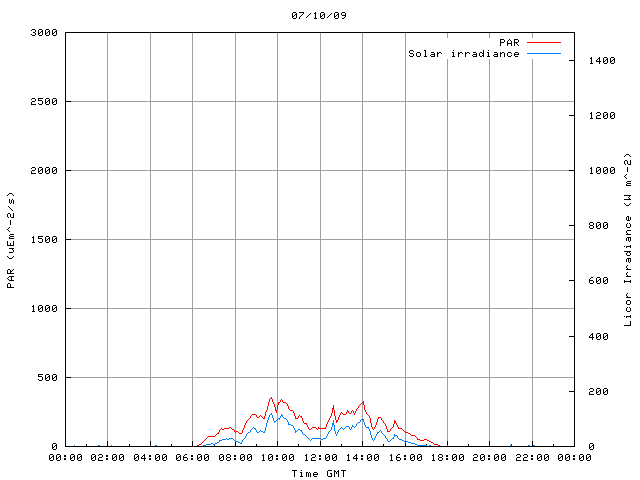 The PML meteorological station, situated on the south-west corner of the building roof, consists of a Hygroclip S3 temperature and humidity sensor housed in a radiation shield, a Mierij Meteo solid state wind sensor (MMW-005), a Chelsea instruments half-hemisphere PAR sensor, a Li-Cor pyranometer (LI-200SZ) and an Omni Instruments 6" tipping bucket raingauge (RG200). The data are logged every 5 minutes using a Pace Scientific XR5 data logger. The real-time rainfall data is likely in error - the correct values will be displayed after a time lag of approximately 24 hours. The meteorological station is sheltered from winds in the north-east and underestimates winds from this quarter. To use these data please contact Dr Tim Smyth.