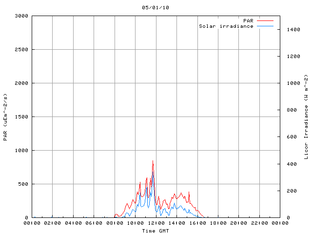 The PML meteorological station, situated on the south-west corner of the building roof, consists of a Hygroclip S3 temperature and humidity sensor housed in a radiation shield, a Mierij Meteo solid state wind sensor (MMW-005), a Chelsea instruments half-hemisphere PAR sensor, a Li-Cor pyranometer (LI-200SZ) and an Omni Instruments 6" tipping bucket raingauge (RG200). The data are logged every 5 minutes using a Pace Scientific XR5 data logger. The real-time rainfall data is likely in error - the correct values will be displayed after a time lag of approximately 24 hours. The meteorological station is sheltered from winds in the north-east and underestimates winds from this quarter. To use these data please contact Dr Tim Smyth.