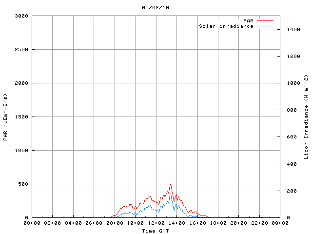 The PML meteorological station, situated on the south-west corner of the building roof, consists of a Hygroclip S3 temperature and humidity sensor housed in a radiation shield, a Mierij Meteo solid state wind sensor (MMW-005), a Chelsea instruments half-hemisphere PAR sensor, a Li-Cor pyranometer (LI-200SZ) and an Omni Instruments 6" tipping bucket raingauge (RG200). The data are logged every 5 minutes using a Pace Scientific XR5 data logger. The real-time rainfall data is likely in error - the correct values will be displayed after a time lag of approximately 24 hours. The meteorological station is sheltered from winds in the north-east and underestimates winds from this quarter. To use these data please contact Dr Tim Smyth.