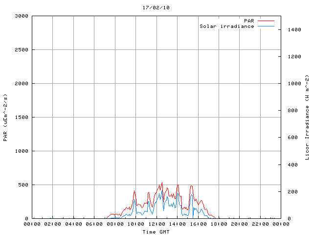 The PML meteorological station, situated on the south-west corner of the building roof, consists of a Hygroclip S3 temperature and humidity sensor housed in a radiation shield, a Mierij Meteo solid state wind sensor (MMW-005), a Chelsea instruments half-hemisphere PAR sensor, a Li-Cor pyranometer (LI-200SZ) and an Omni Instruments 6" tipping bucket raingauge (RG200). The data are logged every 5 minutes using a Pace Scientific XR5 data logger. The real-time rainfall data is likely in error - the correct values will be displayed after a time lag of approximately 24 hours. The meteorological station is sheltered from winds in the north-east and underestimates winds from this quarter. To use these data please contact Dr Tim Smyth.