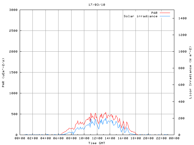 The PML meteorological station, situated on the south-west corner of the building roof, consists of a Hygroclip S3 temperature and humidity sensor housed in a radiation shield, a Mierij Meteo solid state wind sensor (MMW-005), a Chelsea instruments half-hemisphere PAR sensor, a Li-Cor pyranometer (LI-200SZ) and an Omni Instruments 6" tipping bucket raingauge (RG200). The data are logged every 5 minutes using a Pace Scientific XR5 data logger. The real-time rainfall data is likely in error - the correct values will be displayed after a time lag of approximately 24 hours. The meteorological station is sheltered from winds in the north-east and underestimates winds from this quarter. To use these data please contact Dr Tim Smyth.
