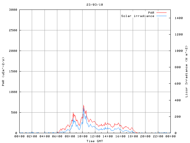 The PML meteorological station, situated on the south-west corner of the building roof, consists of a Hygroclip S3 temperature and humidity sensor housed in a radiation shield, a Mierij Meteo solid state wind sensor (MMW-005), a Chelsea instruments half-hemisphere PAR sensor, a Li-Cor pyranometer (LI-200SZ) and an Omni Instruments 6" tipping bucket raingauge (RG200). The data are logged every 5 minutes using a Pace Scientific XR5 data logger. The real-time rainfall data is likely in error - the correct values will be displayed after a time lag of approximately 24 hours. The meteorological station is sheltered from winds in the north-east and underestimates winds from this quarter. To use these data please contact Dr Tim Smyth.