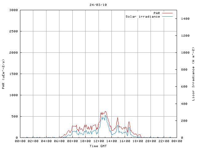 The PML meteorological station, situated on the south-west corner of the building roof, consists of a Hygroclip S3 temperature and humidity sensor housed in a radiation shield, a Mierij Meteo solid state wind sensor (MMW-005), a Chelsea instruments half-hemisphere PAR sensor, a Li-Cor pyranometer (LI-200SZ) and an Omni Instruments 6" tipping bucket raingauge (RG200). The data are logged every 5 minutes using a Pace Scientific XR5 data logger. The real-time rainfall data is likely in error - the correct values will be displayed after a time lag of approximately 24 hours. The meteorological station is sheltered from winds in the north-east and underestimates winds from this quarter. To use these data please contact Dr Tim Smyth.