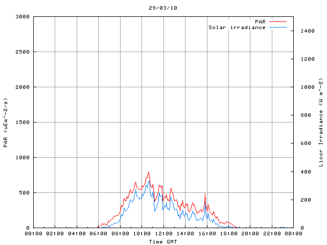 The PML meteorological station, situated on the south-west corner of the building roof, consists of a Hygroclip S3 temperature and humidity sensor housed in a radiation shield, a Mierij Meteo solid state wind sensor (MMW-005), a Chelsea instruments half-hemisphere PAR sensor, a Li-Cor pyranometer (LI-200SZ) and an Omni Instruments 6" tipping bucket raingauge (RG200). The data are logged every 5 minutes using a Pace Scientific XR5 data logger. The real-time rainfall data is likely in error - the correct values will be displayed after a time lag of approximately 24 hours. The meteorological station is sheltered from winds in the north-east and underestimates winds from this quarter. To use these data please contact Dr Tim Smyth.