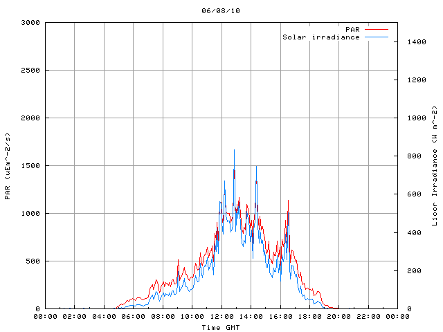 The PML meteorological station, situated on the south-west corner of the building roof, consists of a Hygroclip S3 temperature and humidity sensor housed in a radiation shield, a Mierij Meteo solid state wind sensor (MMW-005), a Chelsea instruments half-hemisphere PAR sensor, a Li-Cor pyranometer (LI-200SZ) and an Omni Instruments 6" tipping bucket raingauge (RG200). The data are logged every 5 minutes using a Pace Scientific XR5 data logger. The real-time rainfall data is likely in error - the correct values will be displayed after a time lag of approximately 24 hours. The meteorological station is sheltered from winds in the north-east and underestimates winds from this quarter. To use these data please contact Dr Tim Smyth.