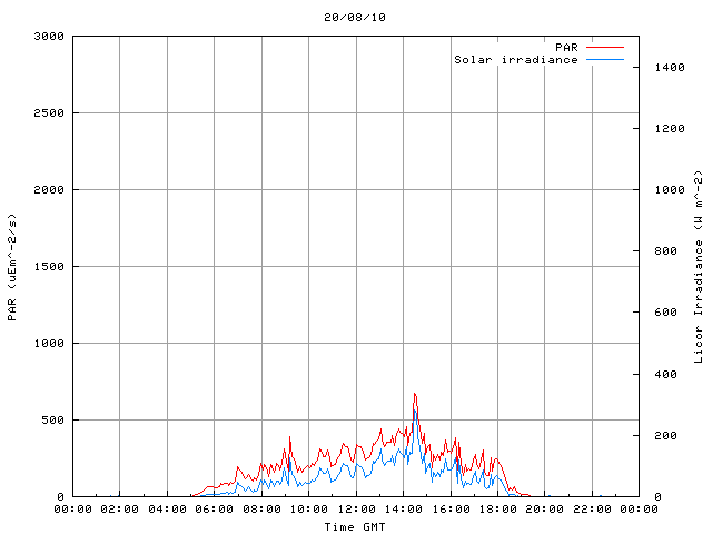 The PML meteorological station, situated on the south-west corner of the building roof, consists of a Hygroclip S3 temperature and humidity sensor housed in a radiation shield, a Mierij Meteo solid state wind sensor (MMW-005), a Chelsea instruments half-hemisphere PAR sensor, a Li-Cor pyranometer (LI-200SZ) and an Omni Instruments 6" tipping bucket raingauge (RG200). The data are logged every 5 minutes using a Pace Scientific XR5 data logger. The real-time rainfall data is likely in error - the correct values will be displayed after a time lag of approximately 24 hours. The meteorological station is sheltered from winds in the north-east and underestimates winds from this quarter. To use these data please contact Dr Tim Smyth.
