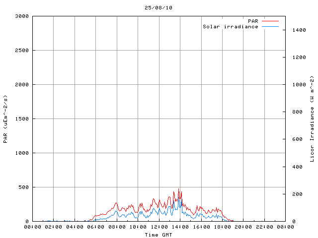 The PML meteorological station, situated on the south-west corner of the building roof, consists of a Hygroclip S3 temperature and humidity sensor housed in a radiation shield, a Mierij Meteo solid state wind sensor (MMW-005), a Chelsea instruments half-hemisphere PAR sensor, a Li-Cor pyranometer (LI-200SZ) and an Omni Instruments 6" tipping bucket raingauge (RG200). The data are logged every 5 minutes using a Pace Scientific XR5 data logger. The real-time rainfall data is likely in error - the correct values will be displayed after a time lag of approximately 24 hours. The meteorological station is sheltered from winds in the north-east and underestimates winds from this quarter. To use these data please contact Dr Tim Smyth.