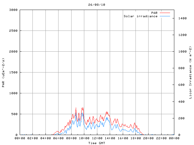 The PML meteorological station, situated on the south-west corner of the building roof, consists of a Hygroclip S3 temperature and humidity sensor housed in a radiation shield, a Mierij Meteo solid state wind sensor (MMW-005), a Chelsea instruments half-hemisphere PAR sensor, a Li-Cor pyranometer (LI-200SZ) and an Omni Instruments 6" tipping bucket raingauge (RG200). The data are logged every 5 minutes using a Pace Scientific XR5 data logger. The real-time rainfall data is likely in error - the correct values will be displayed after a time lag of approximately 24 hours. The meteorological station is sheltered from winds in the north-east and underestimates winds from this quarter. To use these data please contact Dr Tim Smyth.