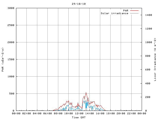 The PML meteorological station, situated on the south-west corner of the building roof, consists of a Hygroclip S3 temperature and humidity sensor housed in a radiation shield, a Mierij Meteo solid state wind sensor (MMW-005), a Chelsea instruments half-hemisphere PAR sensor, a Li-Cor pyranometer (LI-200SZ) and an Omni Instruments 6" tipping bucket raingauge (RG200). The data are logged every 5 minutes using a Pace Scientific XR5 data logger. The real-time rainfall data is likely in error - the correct values will be displayed after a time lag of approximately 24 hours. The meteorological station is sheltered from winds in the north-east and underestimates winds from this quarter. To use these data please contact Dr Tim Smyth.