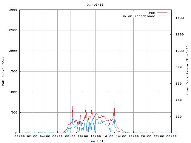 The PML meteorological station, situated on the south-west corner of the building roof, consists of a Hygroclip S3 temperature and humidity sensor housed in a radiation shield, a Mierij Meteo solid state wind sensor (MMW-005), a Chelsea instruments half-hemisphere PAR sensor, a Li-Cor pyranometer (LI-200SZ) and an Omni Instruments 6" tipping bucket raingauge (RG200). The data are logged every 5 minutes using a Pace Scientific XR5 data logger. The real-time rainfall data is likely in error - the correct values will be displayed after a time lag of approximately 24 hours. The meteorological station is sheltered from winds in the north-east and underestimates winds from this quarter. To use these data please contact Dr Tim Smyth.