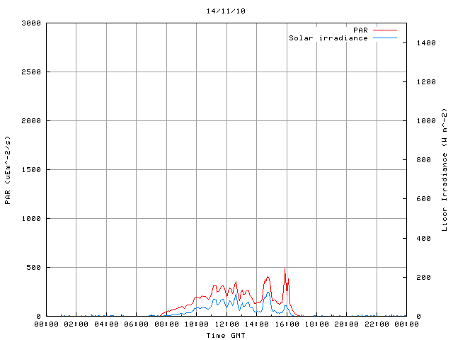 The PML meteorological station, situated on the south-west corner of the building roof, consists of a Hygroclip S3 temperature and humidity sensor housed in a radiation shield, a Mierij Meteo solid state wind sensor (MMW-005), a Chelsea instruments half-hemisphere PAR sensor, a Li-Cor pyranometer (LI-200SZ) and an Omni Instruments 6" tipping bucket raingauge (RG200). The data are logged every 5 minutes using a Pace Scientific XR5 data logger. The real-time rainfall data is likely in error - the correct values will be displayed after a time lag of approximately 24 hours. The meteorological station is sheltered from winds in the north-east and underestimates winds from this quarter. To use these data please contact Dr Tim Smyth.