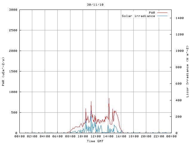 The PML meteorological station, situated on the south-west corner of the building roof, consists of a Hygroclip S3 temperature and humidity sensor housed in a radiation shield, a Mierij Meteo solid state wind sensor (MMW-005), a Chelsea instruments half-hemisphere PAR sensor, a Li-Cor pyranometer (LI-200SZ) and an Omni Instruments 6" tipping bucket raingauge (RG200). The data are logged every 5 minutes using a Pace Scientific XR5 data logger. The real-time rainfall data is likely in error - the correct values will be displayed after a time lag of approximately 24 hours. The meteorological station is sheltered from winds in the north-east and underestimates winds from this quarter. To use these data please contact Dr Tim Smyth.