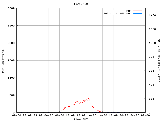 The PML meteorological station, situated on the south-west corner of the building roof, consists of a Hygroclip S3 temperature and humidity sensor housed in a radiation shield, a Mierij Meteo solid state wind sensor (MMW-005), a Chelsea instruments half-hemisphere PAR sensor, a Li-Cor pyranometer (LI-200SZ) and an Omni Instruments 6" tipping bucket raingauge (RG200). The data are logged every 5 minutes using a Pace Scientific XR5 data logger. The real-time rainfall data is likely in error - the correct values will be displayed after a time lag of approximately 24 hours. The meteorological station is sheltered from winds in the north-east and underestimates winds from this quarter. To use these data please contact Dr Tim Smyth.