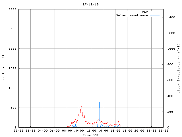 The PML meteorological station, situated on the south-west corner of the building roof, consists of a Hygroclip S3 temperature and humidity sensor housed in a radiation shield, a Mierij Meteo solid state wind sensor (MMW-005), a Chelsea instruments half-hemisphere PAR sensor, a Li-Cor pyranometer (LI-200SZ) and an Omni Instruments 6" tipping bucket raingauge (RG200). The data are logged every 5 minutes using a Pace Scientific XR5 data logger. The real-time rainfall data is likely in error - the correct values will be displayed after a time lag of approximately 24 hours. The meteorological station is sheltered from winds in the north-east and underestimates winds from this quarter. To use these data please contact Dr Tim Smyth.