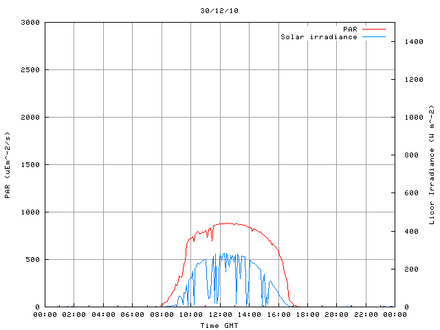 The PML meteorological station, situated on the south-west corner of the building roof, consists of a Hygroclip S3 temperature and humidity sensor housed in a radiation shield, a Mierij Meteo solid state wind sensor (MMW-005), a Chelsea instruments half-hemisphere PAR sensor, a Li-Cor pyranometer (LI-200SZ) and an Omni Instruments 6" tipping bucket raingauge (RG200). The data are logged every 5 minutes using a Pace Scientific XR5 data logger. The real-time rainfall data is likely in error - the correct values will be displayed after a time lag of approximately 24 hours. The meteorological station is sheltered from winds in the north-east and underestimates winds from this quarter. To use these data please contact Dr Tim Smyth.