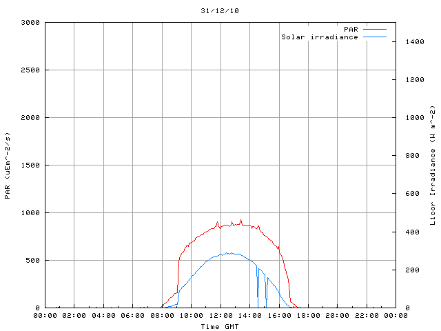 The PML meteorological station, situated on the south-west corner of the building roof, consists of a Hygroclip S3 temperature and humidity sensor housed in a radiation shield, a Mierij Meteo solid state wind sensor (MMW-005), a Chelsea instruments half-hemisphere PAR sensor, a Li-Cor pyranometer (LI-200SZ) and an Omni Instruments 6" tipping bucket raingauge (RG200). The data are logged every 5 minutes using a Pace Scientific XR5 data logger. The real-time rainfall data is likely in error - the correct values will be displayed after a time lag of approximately 24 hours. The meteorological station is sheltered from winds in the north-east and underestimates winds from this quarter. To use these data please contact Dr Tim Smyth.
