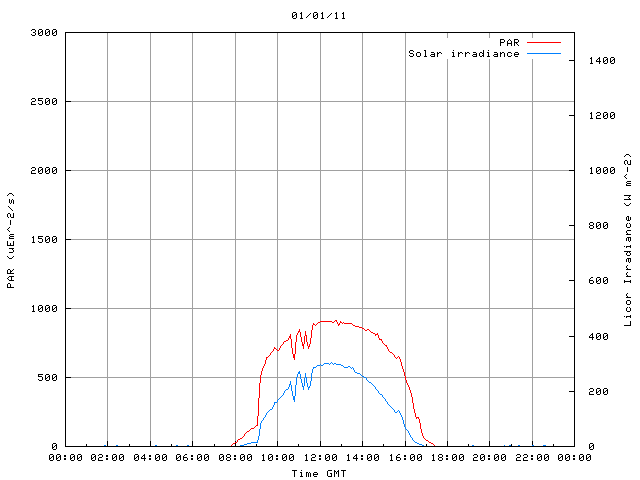 The PML meteorological station, situated on the south-west corner of the building roof, consists of a Hygroclip S3 temperature and humidity sensor housed in a radiation shield, a Mierij Meteo solid state wind sensor (MMW-005), a Chelsea instruments half-hemisphere PAR sensor, a Li-Cor pyranometer (LI-200SZ) and an Omni Instruments 6" tipping bucket raingauge (RG200). The data are logged every 5 minutes using a Pace Scientific XR5 data logger. The real-time rainfall data is likely in error - the correct values will be displayed after a time lag of approximately 24 hours. The meteorological station is sheltered from winds in the north-east and underestimates winds from this quarter. To use these data please contact Dr Tim Smyth.