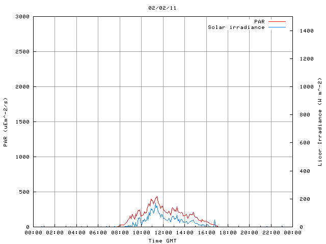 The PML meteorological station, situated on the south-west corner of the building roof, consists of a Hygroclip S3 temperature and humidity sensor housed in a radiation shield, a Mierij Meteo solid state wind sensor (MMW-005), a Chelsea instruments half-hemisphere PAR sensor, a Li-Cor pyranometer (LI-200SZ) and an Omni Instruments 6" tipping bucket raingauge (RG200). The data are logged every 5 minutes using a Pace Scientific XR5 data logger. The real-time rainfall data is likely in error - the correct values will be displayed after a time lag of approximately 24 hours. The meteorological station is sheltered from winds in the north-east and underestimates winds from this quarter. To use these data please contact Dr Tim Smyth.