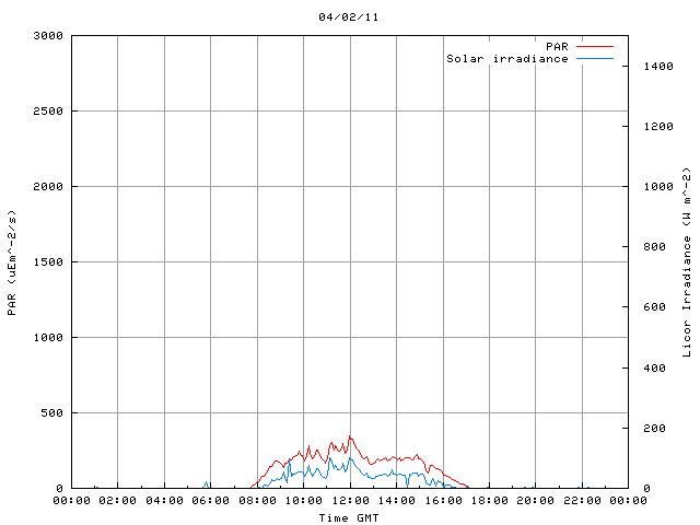 The PML meteorological station, situated on the south-west corner of the building roof, consists of a Hygroclip S3 temperature and humidity sensor housed in a radiation shield, a Mierij Meteo solid state wind sensor (MMW-005), a Chelsea instruments half-hemisphere PAR sensor, a Li-Cor pyranometer (LI-200SZ) and an Omni Instruments 6" tipping bucket raingauge (RG200). The data are logged every 5 minutes using a Pace Scientific XR5 data logger. The real-time rainfall data is likely in error - the correct values will be displayed after a time lag of approximately 24 hours. The meteorological station is sheltered from winds in the north-east and underestimates winds from this quarter. To use these data please contact Dr Tim Smyth.