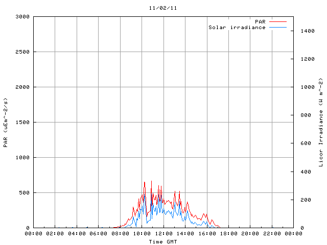 The PML meteorological station, situated on the south-west corner of the building roof, consists of a Hygroclip S3 temperature and humidity sensor housed in a radiation shield, a Mierij Meteo solid state wind sensor (MMW-005), a Chelsea instruments half-hemisphere PAR sensor, a Li-Cor pyranometer (LI-200SZ) and an Omni Instruments 6" tipping bucket raingauge (RG200). The data are logged every 5 minutes using a Pace Scientific XR5 data logger. The real-time rainfall data is likely in error - the correct values will be displayed after a time lag of approximately 24 hours. The meteorological station is sheltered from winds in the north-east and underestimates winds from this quarter. To use these data please contact Dr Tim Smyth.
