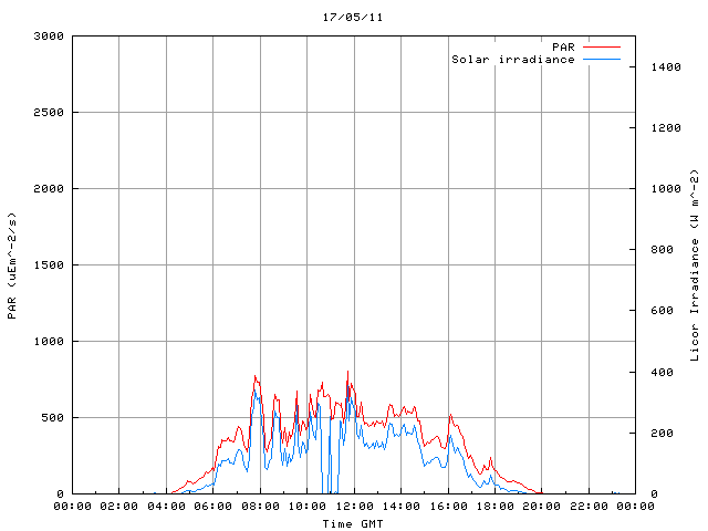 The PML meteorological station, situated on the south-west corner of the building roof, consists of a Hygroclip S3 temperature and humidity sensor housed in a radiation shield, a Mierij Meteo solid state wind sensor (MMW-005), a Chelsea instruments half-hemisphere PAR sensor, a Li-Cor pyranometer (LI-200SZ) and an Omni Instruments 6" tipping bucket raingauge (RG200). The data are logged every 5 minutes using a Pace Scientific XR5 data logger. The real-time rainfall data is likely in error - the correct values will be displayed after a time lag of approximately 24 hours. The meteorological station is sheltered from winds in the north-east and underestimates winds from this quarter. To use these data please contact Dr Tim Smyth.
