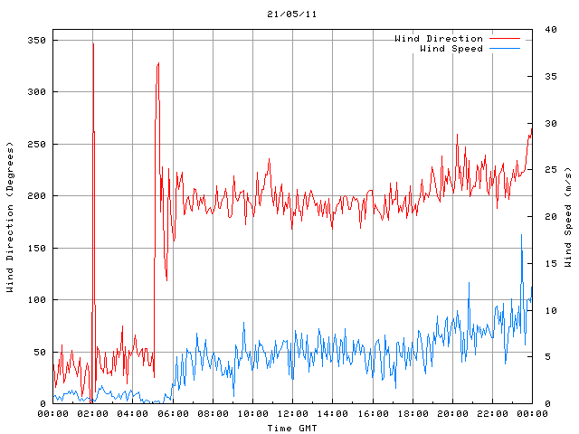 - Max Wind Speed: 18.1 ms-1 Time: 23:27:45 GMT