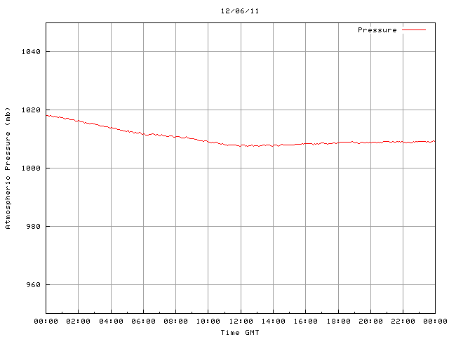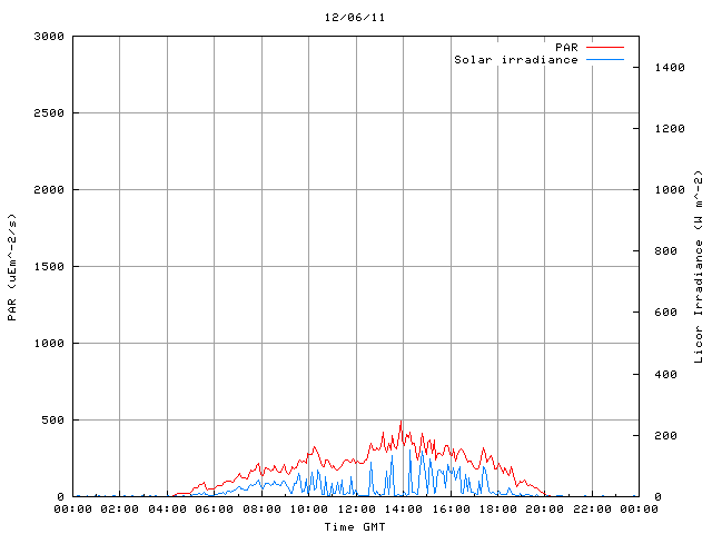 The PML meteorological station, situated on the south-west corner of the building roof, consists of a Hygroclip S3 temperature and humidity sensor housed in a radiation shield, a Mierij Meteo solid state wind sensor (MMW-005), a Chelsea instruments half-hemisphere PAR sensor, a Li-Cor pyranometer (LI-200SZ) and an Omni Instruments 6" tipping bucket raingauge (RG200). The data are logged every 5 minutes using a Pace Scientific XR5 data logger. The real-time rainfall data is likely in error - the correct values will be displayed after a time lag of approximately 24 hours. The meteorological station is sheltered from winds in the north-east and underestimates winds from this quarter. To use these data please contact Dr Tim Smyth.