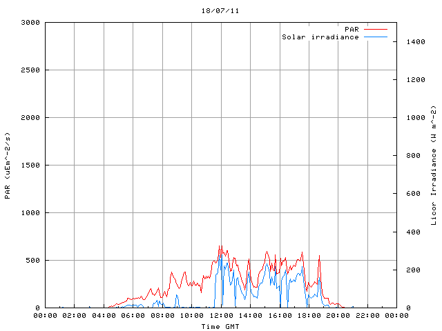 The PML meteorological station, situated on the south-west corner of the building roof, consists of a Hygroclip S3 temperature and humidity sensor housed in a radiation shield, a Mierij Meteo solid state wind sensor (MMW-005), a Chelsea instruments half-hemisphere PAR sensor, a Li-Cor pyranometer (LI-200SZ) and an Omni Instruments 6" tipping bucket raingauge (RG200). The data are logged every 5 minutes using a Pace Scientific XR5 data logger. The real-time rainfall data is likely in error - the correct values will be displayed after a time lag of approximately 24 hours. The meteorological station is sheltered from winds in the north-east and underestimates winds from this quarter. To use these data please contact Dr Tim Smyth.