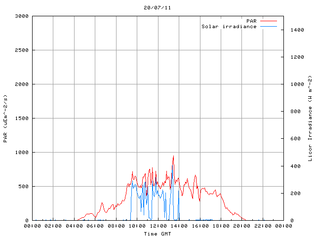 The PML meteorological station, situated on the south-west corner of the building roof, consists of a Hygroclip S3 temperature and humidity sensor housed in a radiation shield, a Mierij Meteo solid state wind sensor (MMW-005), a Chelsea instruments half-hemisphere PAR sensor, a Li-Cor pyranometer (LI-200SZ) and an Omni Instruments 6" tipping bucket raingauge (RG200). The data are logged every 5 minutes using a Pace Scientific XR5 data logger. The real-time rainfall data is likely in error - the correct values will be displayed after a time lag of approximately 24 hours. The meteorological station is sheltered from winds in the north-east and underestimates winds from this quarter. To use these data please contact Dr Tim Smyth.