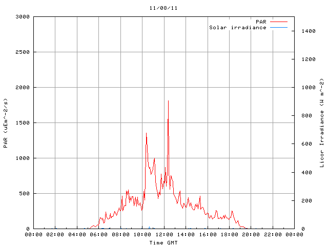 The PML meteorological station, situated on the south-west corner of the building roof, consists of a Hygroclip S3 temperature and humidity sensor housed in a radiation shield, a Mierij Meteo solid state wind sensor (MMW-005), a Chelsea instruments half-hemisphere PAR sensor, a Li-Cor pyranometer (LI-200SZ) and an Omni Instruments 6" tipping bucket raingauge (RG200). The data are logged every 5 minutes using a Pace Scientific XR5 data logger. The real-time rainfall data is likely in error - the correct values will be displayed after a time lag of approximately 24 hours. The meteorological station is sheltered from winds in the north-east and underestimates winds from this quarter. To use these data please contact Dr Tim Smyth.