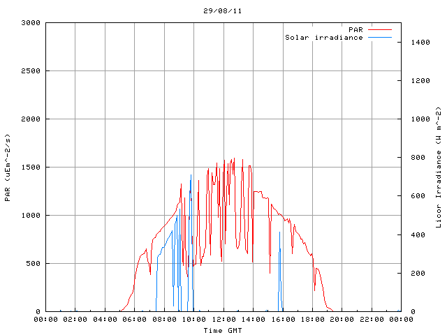 The PML meteorological station, situated on the south-west corner of the building roof, consists of a Hygroclip S3 temperature and humidity sensor housed in a radiation shield, a Mierij Meteo solid state wind sensor (MMW-005), a Chelsea instruments half-hemisphere PAR sensor, a Li-Cor pyranometer (LI-200SZ) and an Omni Instruments 6" tipping bucket raingauge (RG200). The data are logged every 5 minutes using a Pace Scientific XR5 data logger. The real-time rainfall data is likely in error - the correct values will be displayed after a time lag of approximately 24 hours. The meteorological station is sheltered from winds in the north-east and underestimates winds from this quarter. To use these data please contact Dr Tim Smyth.