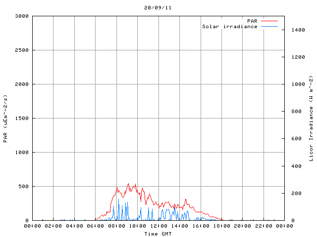 The PML meteorological station, situated on the south-west corner of the building roof, consists of a Hygroclip S3 temperature and humidity sensor housed in a radiation shield, a Mierij Meteo solid state wind sensor (MMW-005), a Chelsea instruments half-hemisphere PAR sensor, a Li-Cor pyranometer (LI-200SZ) and an Omni Instruments 6" tipping bucket raingauge (RG200). The data are logged every 5 minutes using a Pace Scientific XR5 data logger. The real-time rainfall data is likely in error - the correct values will be displayed after a time lag of approximately 24 hours. The meteorological station is sheltered from winds in the north-east and underestimates winds from this quarter. To use these data please contact Dr Tim Smyth.