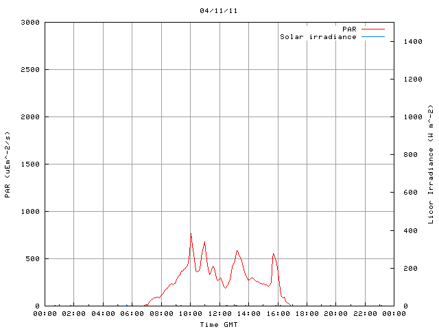 The PML meteorological station, situated on the south-west corner of the building roof, consists of a Hygroclip S3 temperature and humidity sensor housed in a radiation shield, a Mierij Meteo solid state wind sensor (MMW-005), a Chelsea instruments half-hemisphere PAR sensor, a Li-Cor pyranometer (LI-200SZ) and an Omni Instruments 6" tipping bucket raingauge (RG200). The data are logged every 5 minutes using a Pace Scientific XR5 data logger. The real-time rainfall data is likely in error - the correct values will be displayed after a time lag of approximately 24 hours. The meteorological station is sheltered from winds in the north-east and underestimates winds from this quarter. To use these data please contact Dr Tim Smyth.