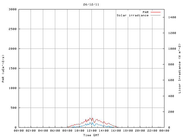 The PML meteorological station, situated on the south-west corner of the building roof, consists of a Hygroclip S3 temperature and humidity sensor housed in a radiation shield, a Mierij Meteo solid state wind sensor (MMW-005), a Chelsea instruments half-hemisphere PAR sensor, a Li-Cor pyranometer (LI-200SZ) and an Omni Instruments 6" tipping bucket raingauge (RG200). The data are logged every 5 minutes using a Pace Scientific XR5 data logger. The real-time rainfall data is likely in error - the correct values will be displayed after a time lag of approximately 24 hours. The meteorological station is sheltered from winds in the north-east and underestimates winds from this quarter. To use these data please contact Dr Tim Smyth.