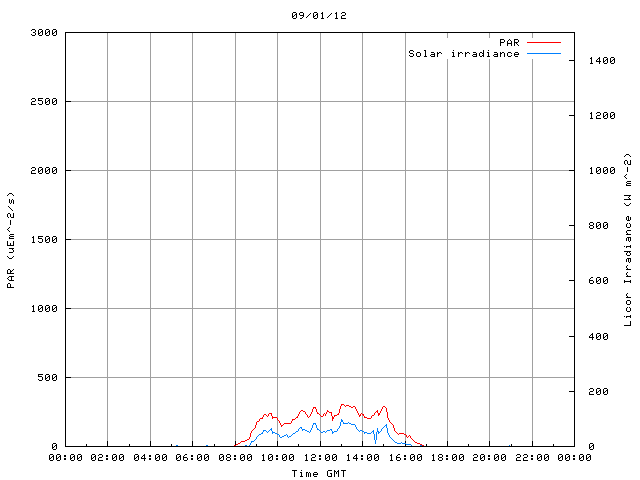 The PML meteorological station, situated on the south-west corner of the building roof, consists of a Hygroclip S3 temperature and humidity sensor housed in a radiation shield, a Mierij Meteo solid state wind sensor (MMW-005), a Chelsea instruments half-hemisphere PAR sensor, a Li-Cor pyranometer (LI-200SZ) and an Omni Instruments 6" tipping bucket raingauge (RG200). The data are logged every 5 minutes using a Pace Scientific XR5 data logger. The real-time rainfall data is likely in error - the correct values will be displayed after a time lag of approximately 24 hours. The meteorological station is sheltered from winds in the north-east and underestimates winds from this quarter. To use these data please contact Dr Tim Smyth.