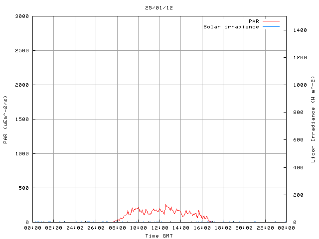 The PML meteorological station, situated on the south-west corner of the building roof, consists of a Hygroclip S3 temperature and humidity sensor housed in a radiation shield, a Mierij Meteo solid state wind sensor (MMW-005), a Chelsea instruments half-hemisphere PAR sensor, a Li-Cor pyranometer (LI-200SZ) and an Omni Instruments 6" tipping bucket raingauge (RG200). The data are logged every 5 minutes using a Pace Scientific XR5 data logger. The real-time rainfall data is likely in error - the correct values will be displayed after a time lag of approximately 24 hours. The meteorological station is sheltered from winds in the north-east and underestimates winds from this quarter. To use these data please contact Dr Tim Smyth.