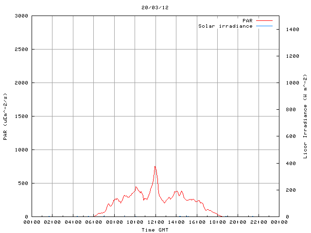The PML meteorological station, situated on the south-west corner of the building roof, consists of a Hygroclip S3 temperature and humidity sensor housed in a radiation shield, a Mierij Meteo solid state wind sensor (MMW-005), a Chelsea instruments half-hemisphere PAR sensor, a Li-Cor pyranometer (LI-200SZ) and an Omni Instruments 6" tipping bucket raingauge (RG200). The data are logged every 5 minutes using a Pace Scientific XR5 data logger. The real-time rainfall data is likely in error - the correct values will be displayed after a time lag of approximately 24 hours. The meteorological station is sheltered from winds in the north-east and underestimates winds from this quarter. To use these data please contact Dr Tim Smyth.