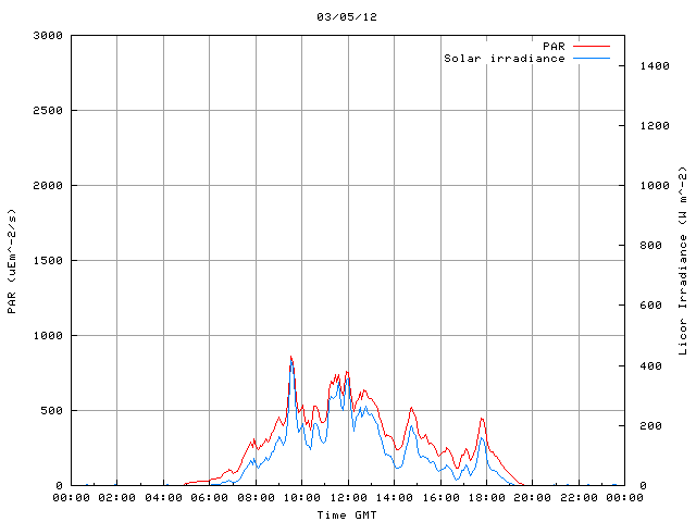 The PML meteorological station, situated on the south-west corner of the building roof, consists of a Hygroclip S3 temperature and humidity sensor housed in a radiation shield, a Mierij Meteo solid state wind sensor (MMW-005), a Chelsea instruments half-hemisphere PAR sensor, a Li-Cor pyranometer (LI-200SZ) and an Omni Instruments 6" tipping bucket raingauge (RG200). The data are logged every 5 minutes using a Pace Scientific XR5 data logger. The real-time rainfall data is likely in error - the correct values will be displayed after a time lag of approximately 24 hours. The meteorological station is sheltered from winds in the north-east and underestimates winds from this quarter. To use these data please contact Dr Tim Smyth.