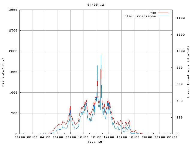 The PML meteorological station, situated on the south-west corner of the building roof, consists of a Hygroclip S3 temperature and humidity sensor housed in a radiation shield, a Mierij Meteo solid state wind sensor (MMW-005), a Chelsea instruments half-hemisphere PAR sensor, a Li-Cor pyranometer (LI-200SZ) and an Omni Instruments 6" tipping bucket raingauge (RG200). The data are logged every 5 minutes using a Pace Scientific XR5 data logger. The real-time rainfall data is likely in error - the correct values will be displayed after a time lag of approximately 24 hours. The meteorological station is sheltered from winds in the north-east and underestimates winds from this quarter. To use these data please contact Dr Tim Smyth.