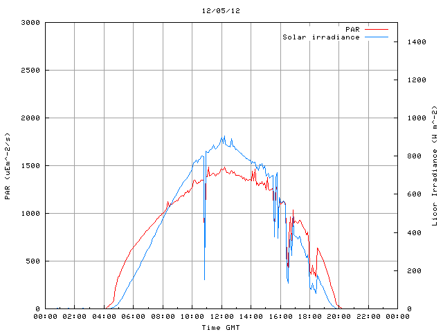The PML meteorological station, situated on the south-west corner of the building roof, consists of a Hygroclip S3 temperature and humidity sensor housed in a radiation shield, a Mierij Meteo solid state wind sensor (MMW-005), a Chelsea instruments half-hemisphere PAR sensor, a Li-Cor pyranometer (LI-200SZ) and an Omni Instruments 6" tipping bucket raingauge (RG200). The data are logged every 5 minutes using a Pace Scientific XR5 data logger. The real-time rainfall data is likely in error - the correct values will be displayed after a time lag of approximately 24 hours. The meteorological station is sheltered from winds in the north-east and underestimates winds from this quarter. To use these data please contact Dr Tim Smyth.