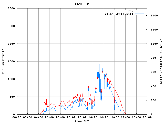 The PML meteorological station, situated on the south-west corner of the building roof, consists of a Hygroclip S3 temperature and humidity sensor housed in a radiation shield, a Mierij Meteo solid state wind sensor (MMW-005), a Chelsea instruments half-hemisphere PAR sensor, a Li-Cor pyranometer (LI-200SZ) and an Omni Instruments 6" tipping bucket raingauge (RG200). The data are logged every 5 minutes using a Pace Scientific XR5 data logger. The real-time rainfall data is likely in error - the correct values will be displayed after a time lag of approximately 24 hours. The meteorological station is sheltered from winds in the north-east and underestimates winds from this quarter. To use these data please contact Dr Tim Smyth.