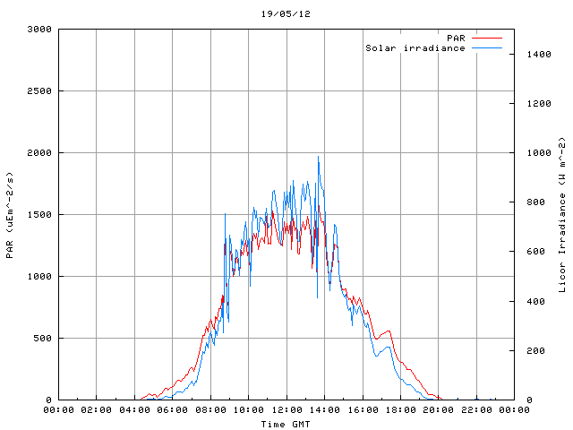 The PML meteorological station, situated on the south-west corner of the building roof, consists of a Hygroclip S3 temperature and humidity sensor housed in a radiation shield, a Mierij Meteo solid state wind sensor (MMW-005), a Chelsea instruments half-hemisphere PAR sensor, a Li-Cor pyranometer (LI-200SZ) and an Omni Instruments 6" tipping bucket raingauge (RG200). The data are logged every 5 minutes using a Pace Scientific XR5 data logger. The real-time rainfall data is likely in error - the correct values will be displayed after a time lag of approximately 24 hours. The meteorological station is sheltered from winds in the north-east and underestimates winds from this quarter. To use these data please contact Dr Tim Smyth.