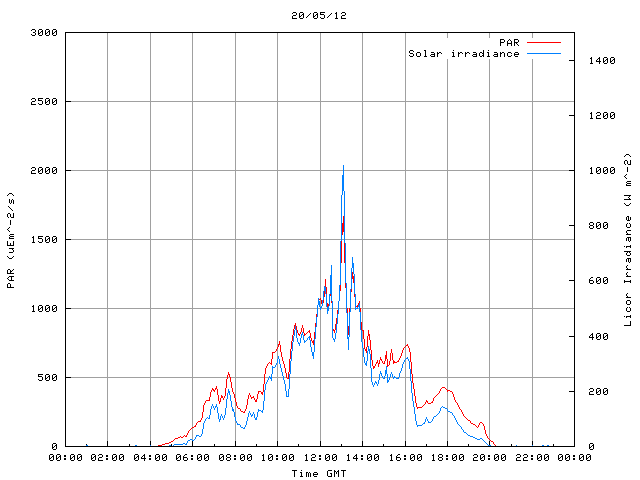 The PML meteorological station, situated on the south-west corner of the building roof, consists of a Hygroclip S3 temperature and humidity sensor housed in a radiation shield, a Mierij Meteo solid state wind sensor (MMW-005), a Chelsea instruments half-hemisphere PAR sensor, a Li-Cor pyranometer (LI-200SZ) and an Omni Instruments 6" tipping bucket raingauge (RG200). The data are logged every 5 minutes using a Pace Scientific XR5 data logger. The real-time rainfall data is likely in error - the correct values will be displayed after a time lag of approximately 24 hours. The meteorological station is sheltered from winds in the north-east and underestimates winds from this quarter. To use these data please contact Dr Tim Smyth.
