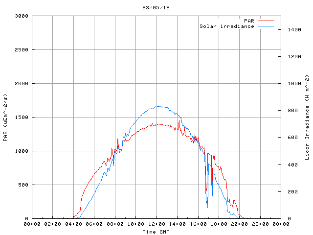 The PML meteorological station, situated on the south-west corner of the building roof, consists of a Hygroclip S3 temperature and humidity sensor housed in a radiation shield, a Mierij Meteo solid state wind sensor (MMW-005), a Chelsea instruments half-hemisphere PAR sensor, a Li-Cor pyranometer (LI-200SZ) and an Omni Instruments 6" tipping bucket raingauge (RG200). The data are logged every 5 minutes using a Pace Scientific XR5 data logger. The real-time rainfall data is likely in error - the correct values will be displayed after a time lag of approximately 24 hours. The meteorological station is sheltered from winds in the north-east and underestimates winds from this quarter. To use these data please contact Dr Tim Smyth.