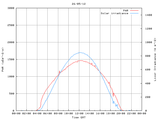 The PML meteorological station, situated on the south-west corner of the building roof, consists of a Hygroclip S3 temperature and humidity sensor housed in a radiation shield, a Mierij Meteo solid state wind sensor (MMW-005), a Chelsea instruments half-hemisphere PAR sensor, a Li-Cor pyranometer (LI-200SZ) and an Omni Instruments 6" tipping bucket raingauge (RG200). The data are logged every 5 minutes using a Pace Scientific XR5 data logger. The real-time rainfall data is likely in error - the correct values will be displayed after a time lag of approximately 24 hours. The meteorological station is sheltered from winds in the north-east and underestimates winds from this quarter. To use these data please contact Dr Tim Smyth.
