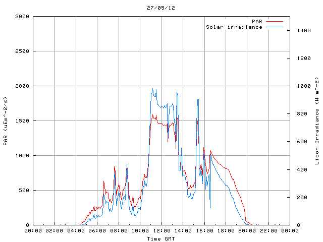 The PML meteorological station, situated on the south-west corner of the building roof, consists of a Hygroclip S3 temperature and humidity sensor housed in a radiation shield, a Mierij Meteo solid state wind sensor (MMW-005), a Chelsea instruments half-hemisphere PAR sensor, a Li-Cor pyranometer (LI-200SZ) and an Omni Instruments 6" tipping bucket raingauge (RG200). The data are logged every 5 minutes using a Pace Scientific XR5 data logger. The real-time rainfall data is likely in error - the correct values will be displayed after a time lag of approximately 24 hours. The meteorological station is sheltered from winds in the north-east and underestimates winds from this quarter. To use these data please contact Dr Tim Smyth.